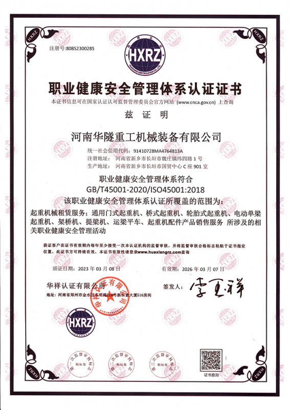 河南華隧重工機械裝備有限公司主要從事通用門式起重機、橋式起重機、電動單梁起重機,輪胎式起重機、架橋機、提梁機、遠梁平車、鋼絲繩電動萌蘆、卷揚機、起重配件制造、銷售:起重機械租賃、安裝和維修,起重設備園收,機械設備維修,鋼結構工程承包,橋梁工程及技術咨淘服務,銷售五金制品、機電設備:建設工程監理,建設工程設計,各類工程建設活動,建筑勞務分包,建筑物折除作業,施工作業,工程管理服務,土石方工程施工,裝如發運。  公司已通過IS0國際質量、環境、健康與安全三合一標準認證,特種設備制造許可證和特種設備安裝改造維修許可證。擁有完熟的質量管理體系。嚴格的管理制度,強大的生產能力和先進的檢測手段,在保證產品質量的同時,也具備了極強的市場競爭力。  公司堅持科技創新為理念,產品質量為核心,注重信譽,建立了減信可靠、快捷、思速。便利周到的售后服務網絡。  我們擁有的技術專家和技術服務隊伍為客戶提供充善的售前技術支持和全天候的售后服務體系,讓您無后顧之憂,享受一站式的超值服務。  “華隧重工,伴您成功“是華隧重工永遠的宗指,真被的希望與各界朋友攜手并進。共創輝準!